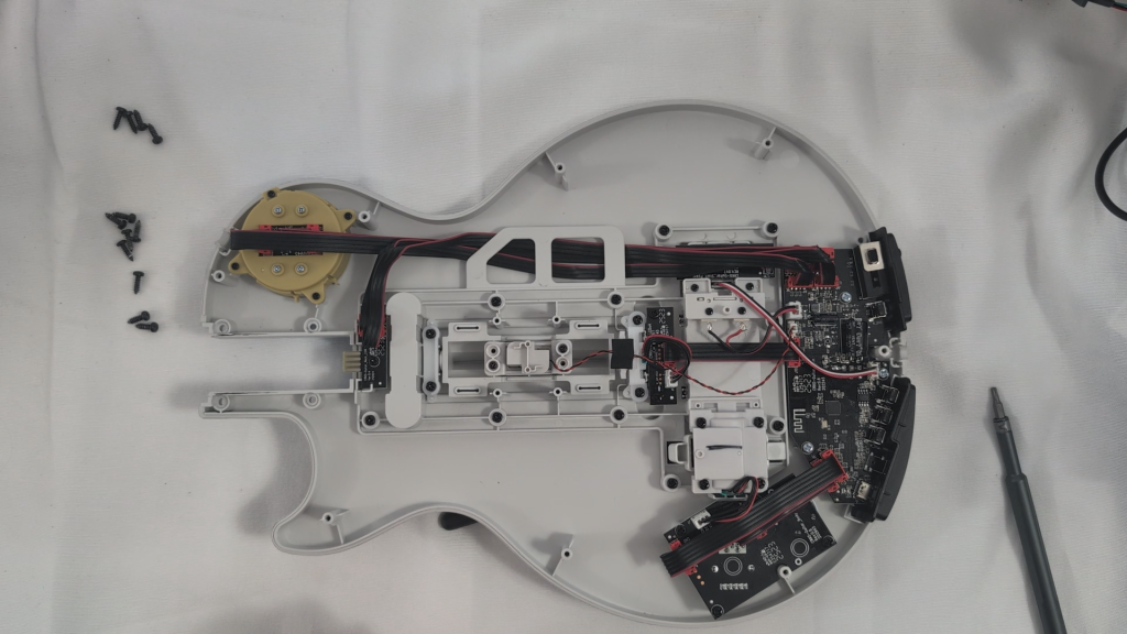 1. Remove 4 T10 torx screws near neck slot on front of guitar body